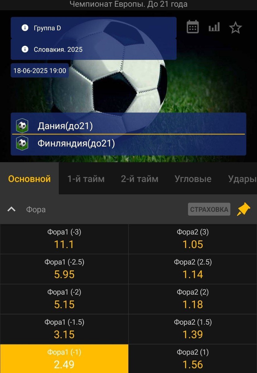 🌚🌚🌚 Чемпионат Европы до 21 года 🏆 🇩🇰 Дания - Финляндия 🇫🇮 Победа Хозяев с форой (-1) ❌❌❌