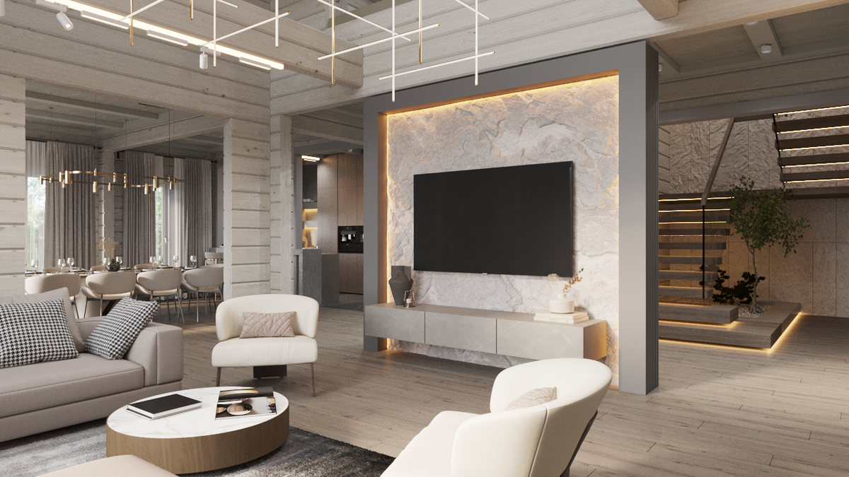 Современный, элегантный и продуманный до мелочей — дом Грейлэнд с интерьером от Анны Полевой. Цветовая гамма — мягкое переплетение бежевого и серого — будто окутывает теплом и зовёт расслабиться. Прогуляемся по первому этажу дома. Центральное внимание — лестница: с каменной стеной и зелёным акцентом под ней. Пространство, которое хочется разглядывать. В кухне — дизайнерская магия: за лаконичными фасадами скрыта потайная кладовая. Удобный полуостров для ленивых завтраков, и парадная столовая с выходом на террасу для душевных ужинов. Деревянные стены приглушены изысканной серой тонировкой, а уют добавляют текстиль в мебели и натуральный шпон в отделке панелей и шкафов. Следите за воплощением красоты в реальность.
