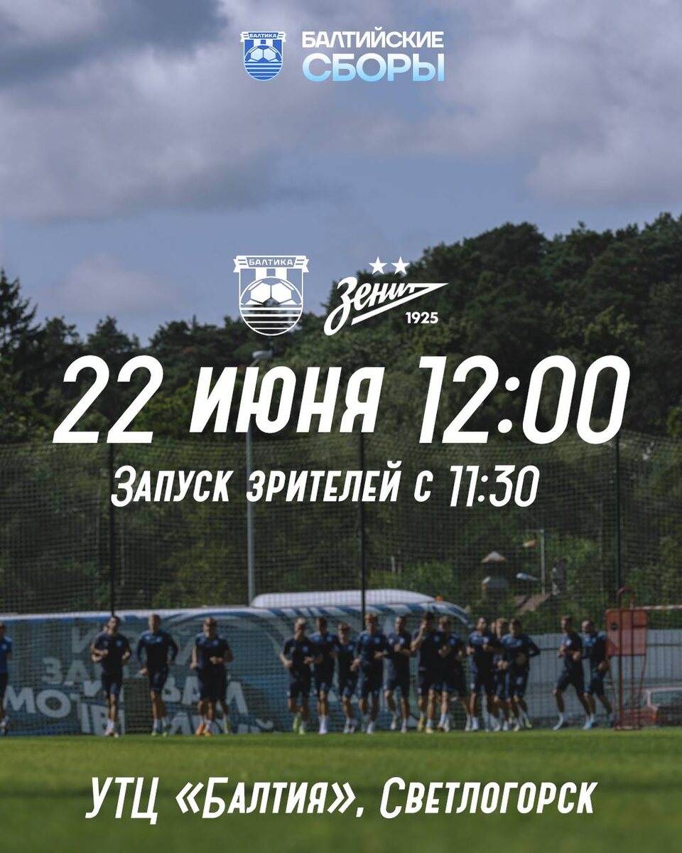 БАЛТИЙСКИЕ СБОРЫ ⚽️ 22 июня в рамках учебно-тренировочного сбора в Светлогорске состоится первый контрольный матч — Балтийцы проведут встречу с ФК «Зенит-2». 📆 22 июня 📍 УТЦ «Балтия», г. Светлогорск ⏰ 12:00, вход будет открыт с 11:30 ⚠️ Для посещения матча необходима предварительная регистрация — количество мест ограничено 🔗 Зарегистрироваться можно по ссылке: https://clck.ru/3Mdvh5 Болельщикам «Зенита-2» необходимо пройти отдельную регистрацию, количество мест так же ограничено: https://clck.ru/3Mdvj3 Вход на территорию УТЦ «Балтия» для гостей будет организован через вход №2. Просим учитывать требования по регистрации и проходу на УТЦ «Балтия». Благодарим за понимание и до встречи! МАТЧ ПРОЙДЕТ В ФОРМАТЕ ДВУХ ТАЙМОВ ПО 30 МИНУТ