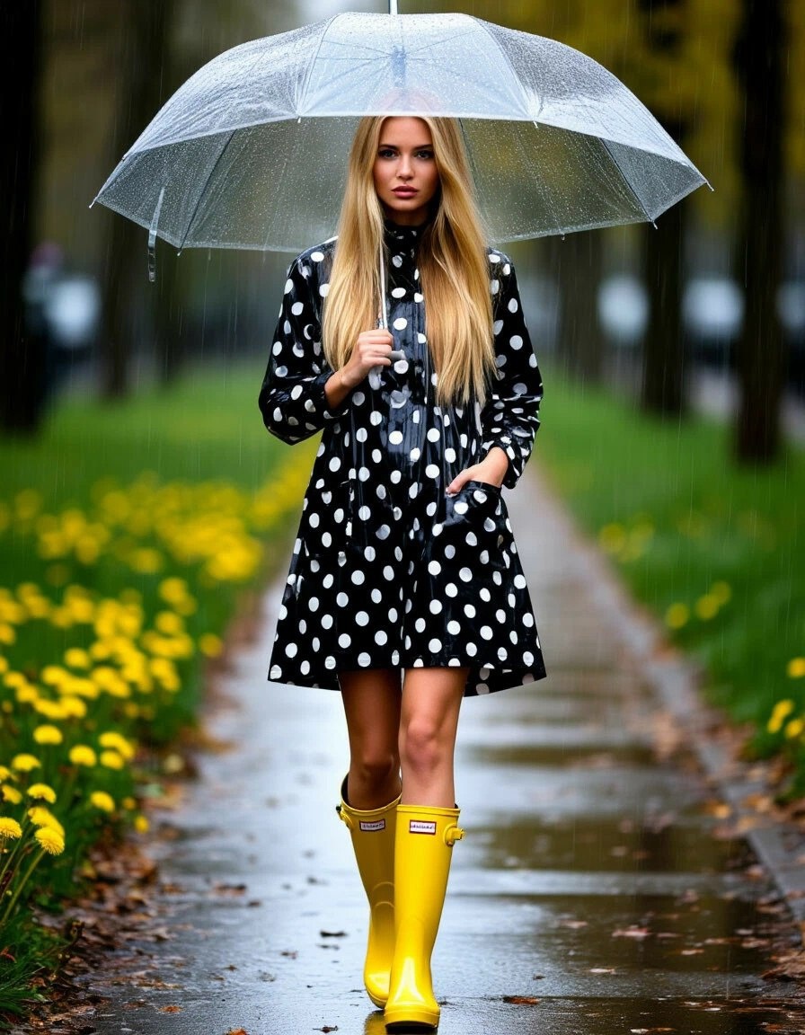 Я гуляю под дождем, а никто замуж не берет... Мария Гликина (Соловьева)© Beautiful woman-model with long blonde hair, wearing a black and white polka dot raincoat dress, carrying a transparent umbrella in the rain, wearing yellow black polka dot rubber boots, full-length fashion shot, street style fashion photography for magazine, with dandelions on both sides of her, depth of field effect, super realistic photo with very detailed details, high resolution, high quality, high detail, sharp focus, hyper realistic, super detailed and HDR #neuroart #нейроарт #ai #ии #нейросеть #картинки #искусственныйинтеллект #цифровоеискусство #digitalart #арт #art #prompt #промпт #подсказка