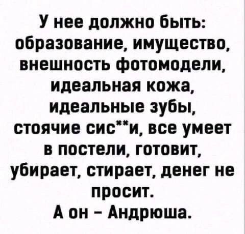 Этот мем метко высмеивает завышенные и односторонние ожидания в отношениях. Когда требования к партнёрше прописаны как чек-лист, а сам «Андрюша» не предлагает ничего, кроме… себя, возникает вполне закономерный вопрос: а где взаимность?