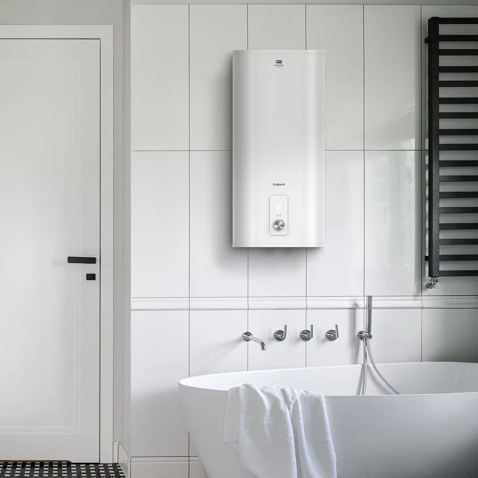 - Экономичность и энергоэффективность. Современные модели потребляют ровно столько энергии, сколько необходимо для нагрева заданного объема воды. У многих накопительных приборов есть таймеры, режимы экономии, а также возможность подключения к умным системам управления домом. Проточные варианты — отличное решение, если горячая вода нужна нерегулярно и в небольших количествах: они включаются только при открытии крана и мгновенно нагревают воду.
