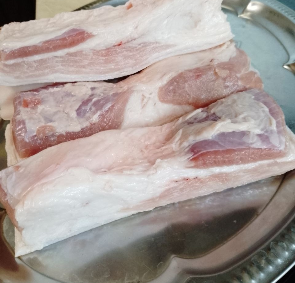 Идет дождь, на улицу не выйти и я решила, наконец-то, разобрать фотографии на компьютере, которых накопилось невероятное множество. Просматривая сотни фоток, создавая новые папки и дополняя уже существующие, я увидела... ОНО.. Сало!!!! 🤩 Фотки всем показаны, сало уже давно съедено, а рецепт не оформлет... Непорядок! 🧐 Исправляю досадное упущение с моей стороны. 😉 У меня были 4 вот таких, достаточно мясных кусочка сала на коже. Вес и размер для данного рецепта не имеет значения. Итак, берем форму в которой мы будем солить сало. Я солю в пластиковом контейнере, который можно использовать для пищевых продуктов. На дно контейнера насыпали соль ( я использую обычную мелкую соль, Вы можете взять тут соль, которая у Вас есть) щедрым слоем +дробленный черный перец ( можно взять молотый) +душистый перец+ не много поломанного на небольшие кусочки лавровый лист. Можно добавить тонко нарезанные кусочки чеснока. Укладываем куски сала кожей вниз. Сверху засыпаем посолочной смесью и выклады