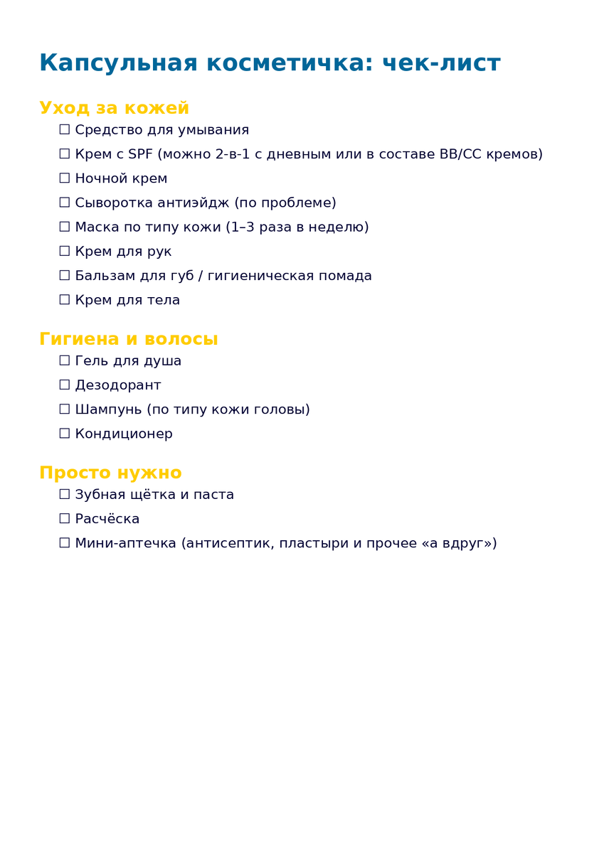 Зайди в ванную. Сколько там баночек? Пять? Десять? А теперь будь честна — сколько из них ты реально используешь? То, что мы называем «уходом», часто превращается в склад просроченных экспериментов: — Крем, который "ждёт лета" уже третий год — Маска, которая "не подошла, но жалко выбрасывать" — Пенка, у которой даже запах изменился, но вроде ещё норм Хватит. Пора разгрести косметический бардак и собрать каспульную косметичку — только нужное, без суеты и бессмысленных флаконов. 🧴 Уход за кожей • Средство для умывания • Крем с SPF (можно 2-в-1 или в BB/CC) • Ночной крем • Сыворотка антиэйдж (только по делу) • Маска по типу кожи (1–3 раза в неделю) • Крем для рук • Бальзам для губ • Крем для тела Это не магия. Это база, чтобы кожа не кричала SOS. 🛁 Гигиена и волосы • Гель для душа • Дезодорант • Шампунь (по коже головы, не по вкусу маркетолога) • Кондиционер Никаких розовых пен с блёстками, просто рабочие вещи. 🧼 Просто нужно • Зубная щётка и паста • Расчёска • Мини-апте
