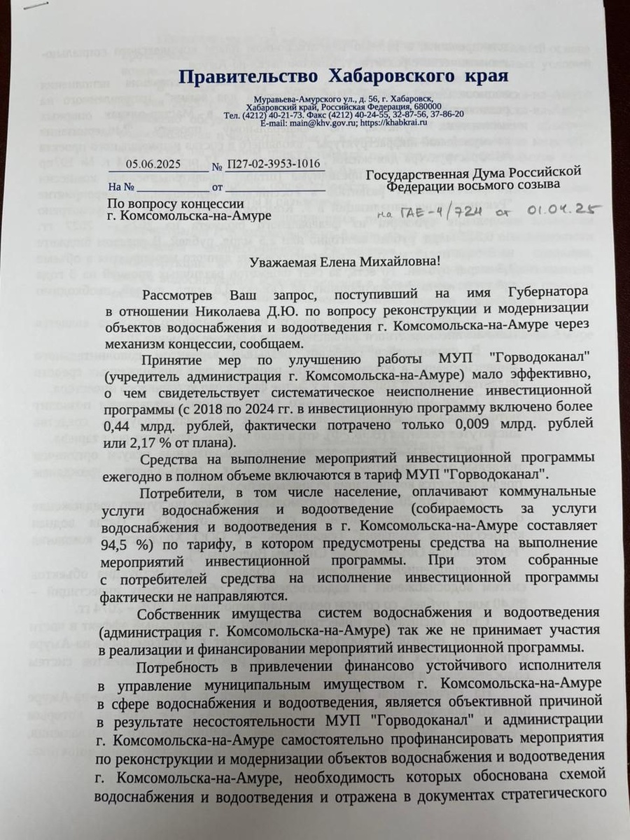 Недавно мы получили очередной ответ из правительства Хабаровского края по поводу концессии «Горводоканала» г. Комсомольска-на-Амуре. На сей раз – на письмо, которое по нашей просьбе направляла депутат Государственной Думы Глазкова Анжелика Егоровна. Почему она? Потому что её коллега – депутат Павел Симигин – вообще ничего нам не ответил на наше письмо. Собственно, надежды на него и так не было, поскольку «ворон ворону глаз не выклюнет», как известно. Так вот, этот ответ вновь повторял практически все доводы, которые ранее нам приходили от других чиновников краевого правительства. Что мол, инвестпрограмма не исполнялась, что город не состоятелен, что есть только 3,8 млрд, а надо 6,7… На всё это мы ранее уже отвечали в нашей статье «Чиновники Хабаровского края продолжают играть в слепо-глухонемого». Но одно заявление в ответе всё же привлекло наше внимание: «По результатам завершившихся переговоров протоколом комиссии администрации г. Комсомольска-на-Амуре от 30 мая 2025 г. о возможности