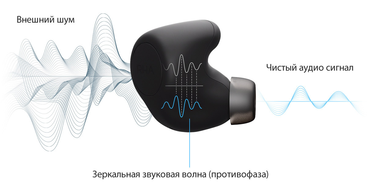 - Динамик воспроизводит эту волну вместе с музыкой. Две волны (исходная и инвертированная) сталкиваются и нейтрализуют друг друга до попадания в ухо.