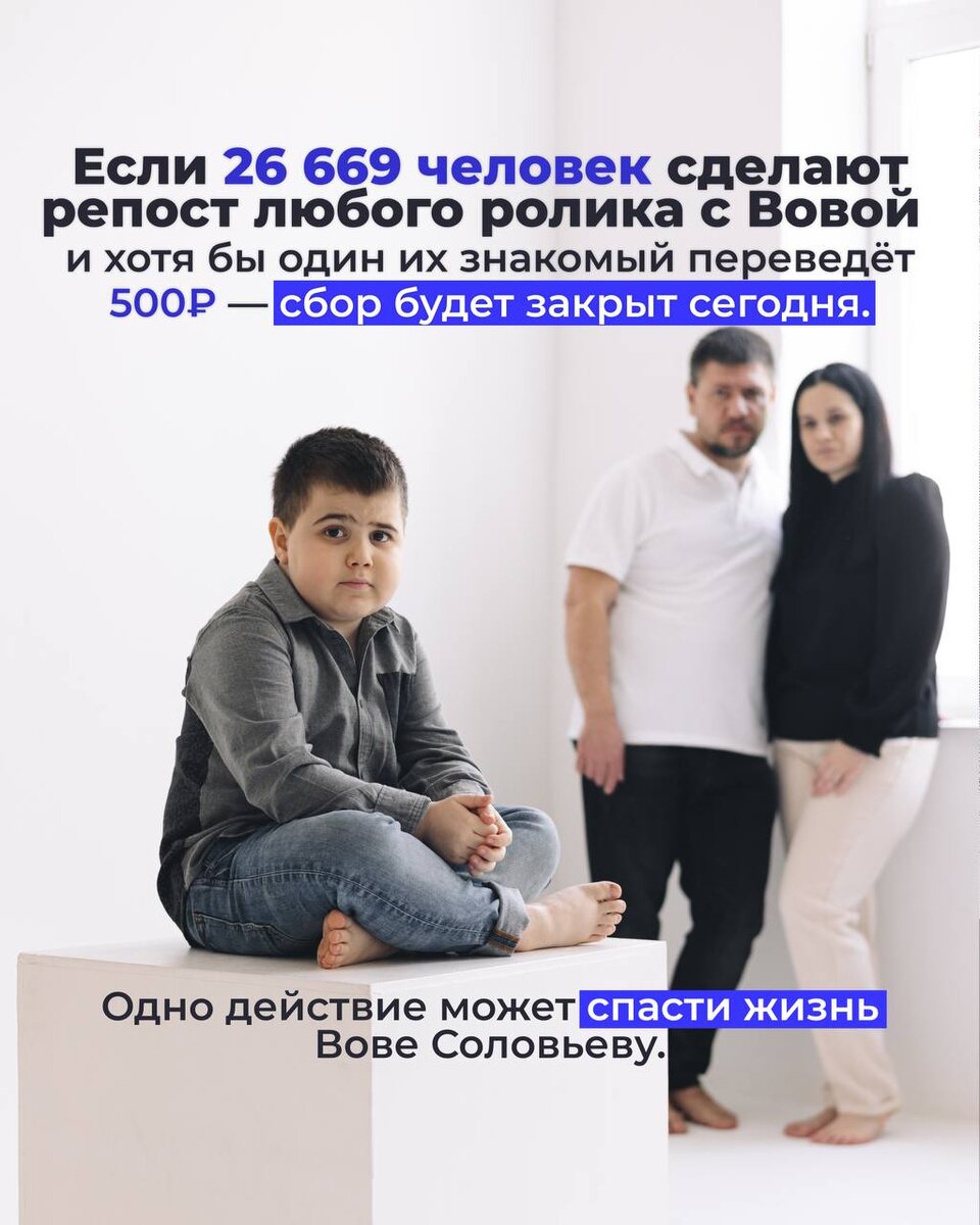 Если 26 669 человек сделают репост любого ролика с Вовой и хотя бы один из их знакомых переведёт 500рублей, то сбор будет закрыт. Нам нужна максимальная огласка, чтобы спасти Вову. Прошу каждого из Вас.🙏 Возьмите любое видео с нашей страницы и сделайте репост. Только вместе мы сможем победить в этой борьбе! Осталось собрать 13,3млн.руб. 👥 Всего 26 669 человек по 500 ₽ — и сбор будет закрыт! Сейчас нельзя терять ни дня: 📌 Каждые сто рублей важны 📌 Каждый репост может найти ещё одного доброго человека Вова Соловьёв, 8 лет Диагноз: Миодистрофия Дюшенна Мы боремся за его жизнь и верим — у нас ещё есть шанс! Реквизиты: Перевод по номеру тел.+7(918)499-99-81 Заира Масхудовна С. (Мама) СБЕР В комментариях к платежу: Вове на лечение. Все документы, фонды, способы помощи, переводы с зарубежных карт — по ссылке vova-solovyev.ru