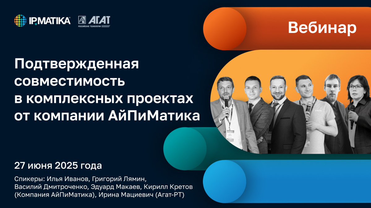 27 июня 2025 года с 11:00 до 12:00 Илья Иванов, Григорий Лямин, Василий Дмитроченко, Эдуард Макаев, Кирилл Кретов (ООО АйПиМатика) и Ирина Мациевич (Агат-РТ) проведут вебинар «Подтвержденная совместимость в комплексных проектах от компании АйПиМатика». В программе вебинара: Зарегистрироваться на вебинар можно по ссылке.