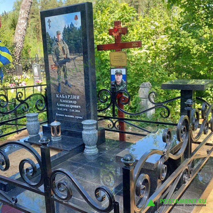 Словно застывшая скорбь, черный карельский габбро-диабаз воплотился в монумент. На лицевой стеле – керамический портрет героя в полный рост, запечатлевший его в боевой амуниции, символ несокрушимости в грозный час. На обратной стороне – трогательный контраст: гравировка мирного времени. Здесь воин – любящий хозяин, запечатленный рядом со своим верным двухколесным конем и преданным четвероногим другом. Цветник частично укрыт плитой, будто тихой надеждой на вечный покой. Кованая ограда, как кружево печали, обрамляющее захоронение воина, установлена на гранитный цоколь. Площадка вымощена гранитной плиткой, приглашая к тихим размышлениям. Гранитная скамья и столик – уютный уголок для тех, кто придет почтить память героя, место, где можно разделить с ним безмолвное братство. Этот мемориальный комплекс – дань памяти защитнику, отдавшему жизнь за мирное небо. Он станет вечным напоминанием об отваге и самопожертвовании воина, вставшего на защиту мирных жителей. Вы можете оставить заявку на наш