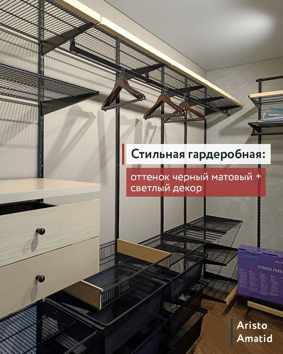 Система хранения может быть не просто удобной, но и красивой. Например, сочетание черной гардеробной системы со светлым декором — беспроигрышная классика: 🔶 Черный матовый металл смотрится выразительно и подчеркивает геометрию. 🤍 Светлые стены, фасады или полки добавляют ощущение простора. Вместе получается контраст, который делает гардеробную акцентом в интерьере и радует глаз. В Аматид мы поможем продумать наполнение и оформить пространство так, чтобы оно было функциональным и стильным одновременно. Пишите — подберем красивое и удобное решение. •Консультируем здесь @Amatidru •Или по тел.: +79219170608 •2 салона СПб, монтажные бригады СПб и Мск •Отправляем в другие города •Можно купить в рассрочку