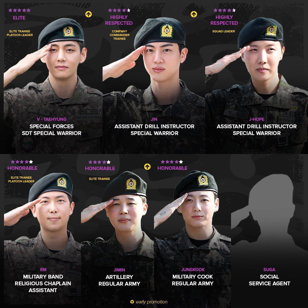 Чем занимались BTS в армии? От сержанта спецназа Тэхёна до элитного инструктора по строевой подготовке Джина, изучим и запомним их военные звания и достижения. 21 июня 2025 года состоится официальное возвращение всех семи участников BTS к гражданской жизни после того, как Шуга завершит свою альтернативную службу. За последние два года каждый участник группы выполнил свои обязательные военные обязанности. Некоторые через действительную службу, а другие через общественные роли. Они заслужили признание за свою приверженность и работу. Поклонники получили представление об их посвящении через случайные фотографии Weverse или официальные военные релизы. Участники BTS играли разные роли во время своей военной службы. Такие звания, как «Специальный воин», «Элитный стажер» или «Командир взвода» в южнокорейской армии присваиваются солдатам, которые преуспевают в таких областях, как стрельба, выносливость, дисциплина или лидерство. Кроме того, такие звания, как «Сержант», указывают на положение с