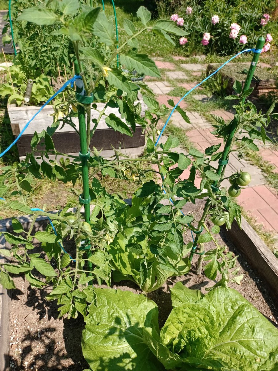Формировка детерминантный томатов кажется простой. Типа по минимуму пасынковать, да подвязать. На деле же куда сложней, чем формировка томатов в теплице. Там же всё просто, все пасынки убрал, один ствол тянешь на шпагат и всё. А тут нужно понимать, какой пасынок через некоторое время каким станет. Где будет загущение, а где пустота. За пару дней все 4 высокие грядки привёл в порядок. Итого 24 кустика.