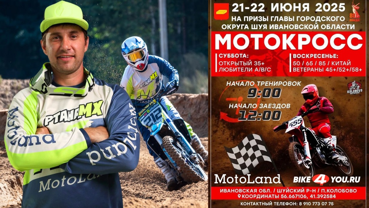 ▶️🏍 Motoland Racing Team выходит на старт при поддержке bike4you.ru! Друзья, грядет мотокросовое событие лета! 21-22 июня в Шуе состоится масштабный Мотокросс на Призы Главы Городского Округа, где наша команда выступит при официальной поддержке интернет-магазина мототехники и экипировки bike4you.ru! На старт выйдут наши лучшие пилоты: 🔥 Птахин Андрей на мощнейшем PWR FS450 NC (194MQ) 🔥 Суханин Сергей на легендарном Мотоцикл Кросс Motoland XT 450 ST NC Специально для этих соревнований наши мотоциклы были подготовлены с использованием оригинальных запчастей и аксессуаров от bike4you.ru ! 📍 Место проведения: Ивановская обл., Шуйский р-н, п. Колобово (координаты: 56.667106, 41.392584) 📅 Даты: 21-22 июня 2025 года ℹ️ Организационная информация: ✔️ В субботу (21.06) добавлен класс ОТКРЫТЫЙ (35+) ✔️ Класс КИТАЙ (22.06) ⏳ Регистрация открыта до 21:00 19.06! Приезжайте поболеть за Motoland Racing Team! Мы гарантируем - будет мощно, быстро и зрелищно! #MotolandRacing #bike4you #PWRF