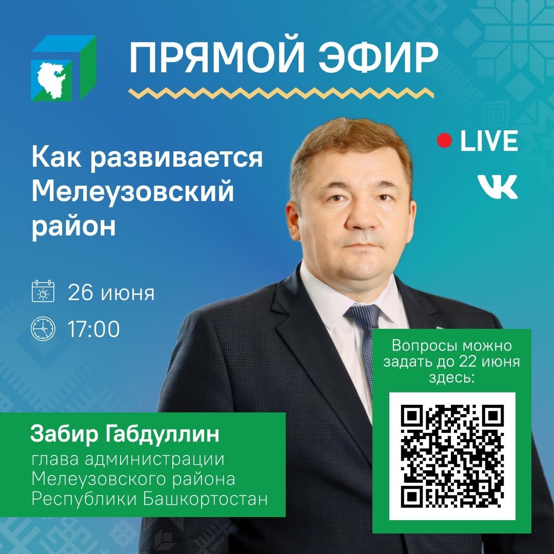 Как развивается Мелеузовский район – о планах благоустройства, ремонте дорог, развитии инфраструктуры, социальной поддержке и других волнующих жителей темах – глава Мелеузовского района Забир Габдуллин. Смотрите эфир на странице Центра управления республикой в ВК https://vk.com/tsur_bashkortostan 26 июня. Начало трансляции в 17:00. Свои вопросы можно оставить до 22 июня на Платформе обратной связи «Госуслуги. Решаем вместе» https://pos.gosuslugi.ru/lkp/direct-line/8870/ 💚 ЦУР Башкортостана
