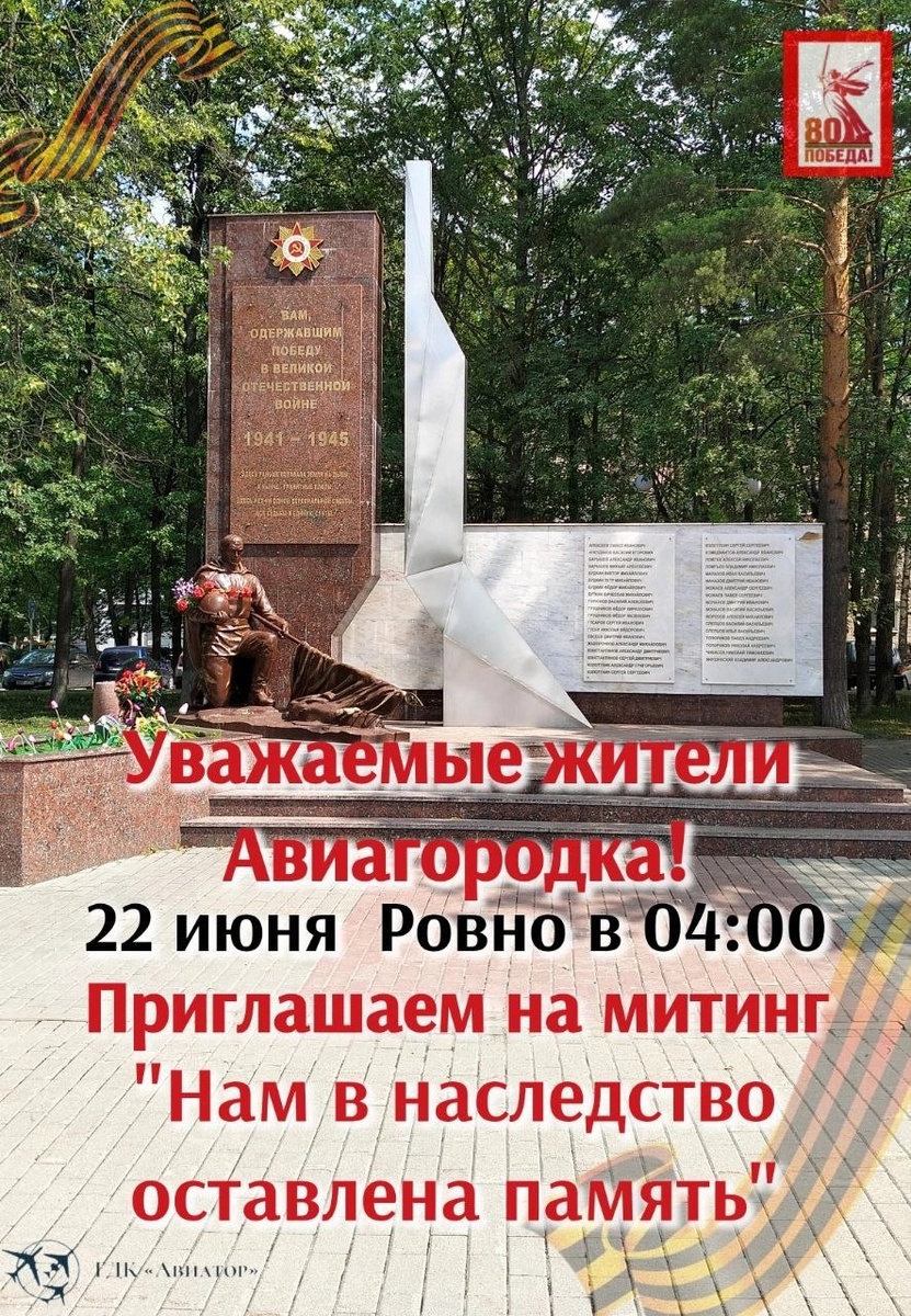 ✨ ❗Уважаемые жители Авиагородка❗ Приглашаем на митинг «Нам в наследство оставлена Память» - посвященный годовщине начала Великой Отечественной войны. 📆 22.06.2025🕒04:00 🏢 Городской дом культуры «Авиатор» 📍 г. Домодедово, ул.Гагарина, д.1 ✅ Мероприятия Домодедово https://dzen.ru/id/66f10385cc4c5a16f7b5fb02 http://vk.com/domodedovo_events http://dzen.ru/domodedovo_events