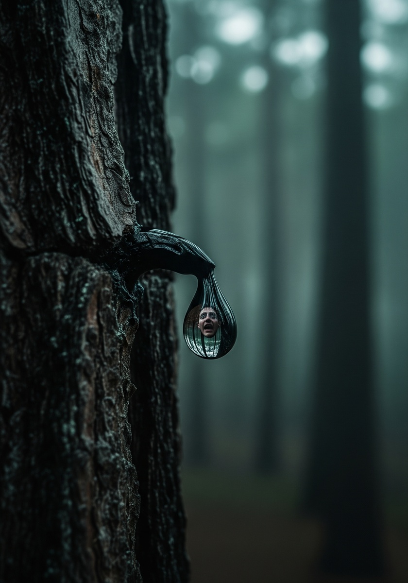 Это был старый, дремучий сосновый бор. Деревья здесь стояли так плотно, что их кроны почти не пропускали свет, создавая вечный сумрак. Но странным было не это. Стволы сосен были покрыты не обычной смолой. Из трещин в коре медленно, как слёзы, сочилась тёмная, почти чёрная, вязкая жидкость. Она собиралась в крупные, маслянистые капли и тяжело падала на мох, который в этих местах был бурым и жухлым.