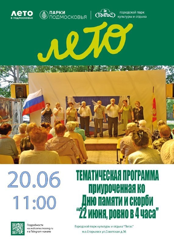Парк культуры и отдыха «Пегас» приглашает в летний кинотеатр на тематическую программу "22 июня ровно в 4 часа", приуроченную ко Дню памяти и скорби. 22 июня 1941 года! В этот день жизнь почти 200 млн человек разделилась на «до и после». Летнее воскресенье пошло не по плану – по всем городам разнеслось тревожное сообщение о нападении вражеских войск на Советский Союз. Так начались 1418 дней, полных подвигов и мужества. Несмотря на все тяготы и лишения, страх и голод, наши предки сделали всё, чтобы принести стране Великую Победу! 20 июня в 11:00 #подмосковье #НашеПодмосковье #муниципальныйокругЕгорьевск #моЕгорьевск #егорьевскоетелевидение #егорьевскоетв #Егорьевск #администрацияегорьевск