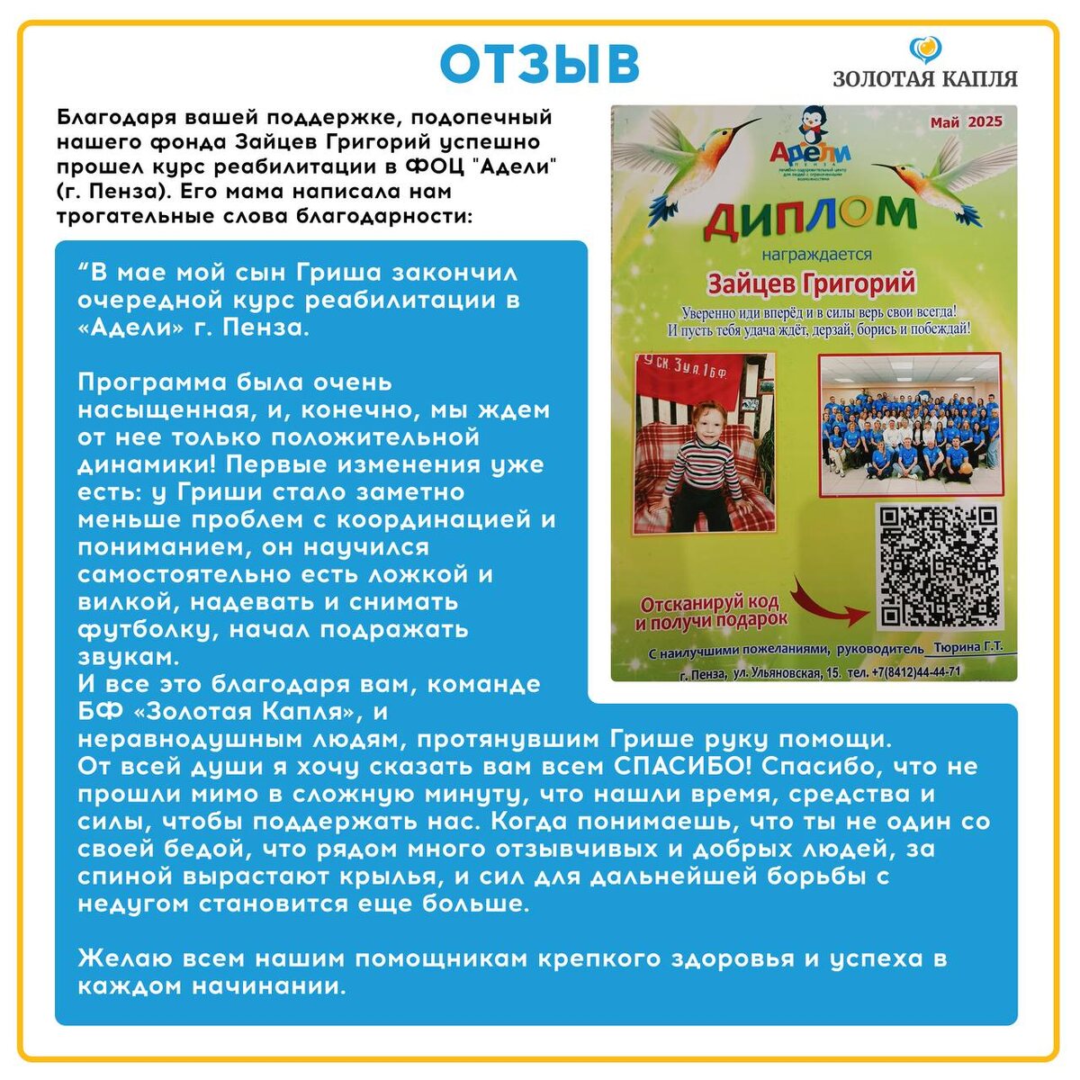 Ваша доброта и отзывчивость творят настоящие перемены— сегодня мы видим, как Григорий шаг за шагом преодолевает трудности, обретая новые силы и уверенность. Вместе мы делаем мир добрее и светлее! ❤️