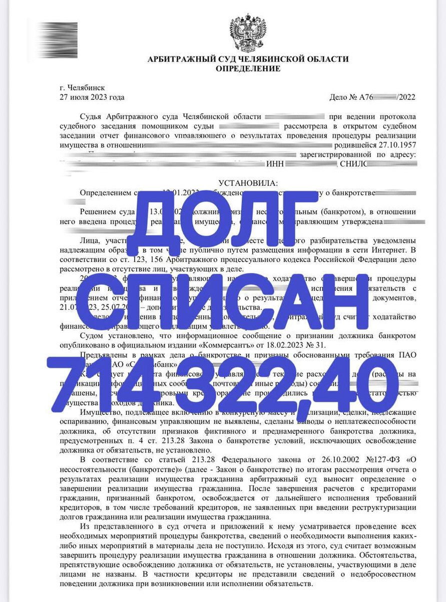 👵 Кредит на внука, долги за лекарства и списанные - спасение Зинаиде Петровне — 64 года. Живёт в Челябинской области, на пенсии. 👩👦 Сын — в разводе, внуку 9 лет. Она бабушка, которая хотела помочь семье, а оказалась по уши в долгах. 💳 Началось с "всего одной карты" на подарки к школе… ✔️Сначала — новая куртка для внука: 8 000 ₽ ✔️Потом — ноутбук «на дистанционку» — ещё 34 000 ₽ ✔️Потом — лекарства себе: давление, суставы ✔️Потом — «ну не хватило чуть-чуть» ✔️А потом — банк, ещё один банк, МФО, займы под 1,2% в день 📉 Пенсия — 18 900 ₽ 💥 А ежемесячные выплаты — 21 000 ₽ Уже не хватало даже на еду. 🥺 Коллекторы не жалели никого Общая сумма к моменту обращения: 714 300 ₽ 🔻 Пенсия — ниже прожиточного 🔻 Кредитов — 6 🔻 Просрочек — 9 месяцев 🔻 Давление — 180/110… 🧑⚖️ Юрист сказал: «Вы имеете право на банкротство» Сын всё-таки узнал. Сам повёл её на бесплатную консультацию. Начали работу: 📂 Документы — через госуслуги 📂 Доход — только пенсия 📂 Имущества — нет 📂 Пове