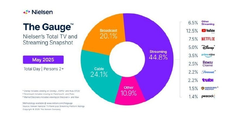 Впервые стриминговые сервисы обогнали эфирное и кабельное телевидение в США по объёму просмотров за месяц.
