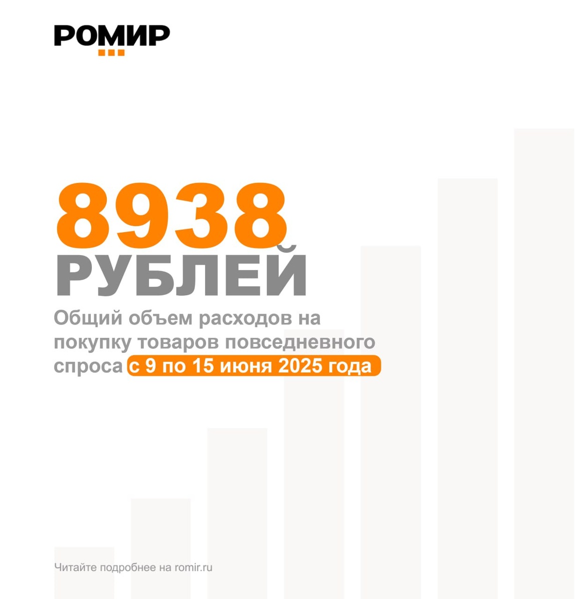 8938 рублей потратила в среднем на продукты питания и товары повседневного спроса среднестатистическая российская семья на неделе со 9 по 15 июня, что на 609 рублей (6.8%) больше, чем неделей ранее. Относительно аналогичной недели прошлого года объем недельных расходов вырос на 2024 рубля или на 29.3%. 🔸 Начало лета также является периодом завершения учебного года и проведения выпускных мероприятий в школах. Подготовка к праздничным столам для таких событий требует значительных закупок, что оказывает заметное влияние на общий объем расходов домохозяйств. #индекснедельныхрасходов #индекспокупательскойактивности @romir_real