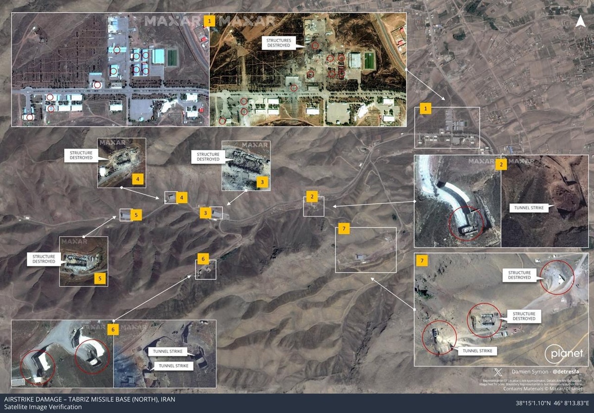 Maxar sun’iy yo‘ldosh tasvirlari Eron shimolidagi Tabriz raketa bazasida yangi shikastlanishlarni qayd etdi. Baza Isroil hujumlariga uchragan. @daryolive