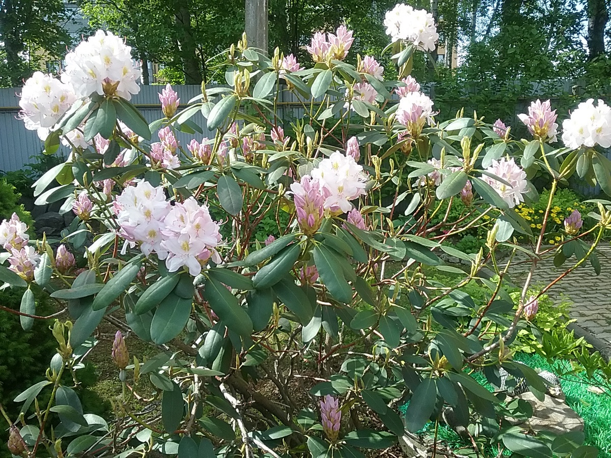 Взрослый рододендрон. Герой моей публикации вечнозелёный рододендрон "Album Novum". Куплен трёхлеткой с закрытой корневой системой. Заявленная максимальная высота растения была 150 см. Сейчас, по прошествии 10 лет, после посадки его размер больше 180 см. Считаю, что этот капризный товарищ растёт столько лет благополучно, благодаря правильно подобранным условиям. Во-первых, сторона света. С восточной стороны дома утром и днём ажурная тень от берёз соседней рощи. Во-вторых, кислая, рыхлая, торфянистая почва. Осенью соседние берёзы щедро сбрасывают листву, которая из года в год, служит рододендрону очень полезной мульчей. В-третьих, ему достаточно влаги. Если дождей долго нет, то полить - не проблема. В-четвёртых, хорошее укрытие на зиму. У нас бывают и 30-ти градусные морозы. Обёртывание куста плотным нетканным материалом спасает не только от мороза, но и от поломки большим снегом. В-пятых, после зимы н