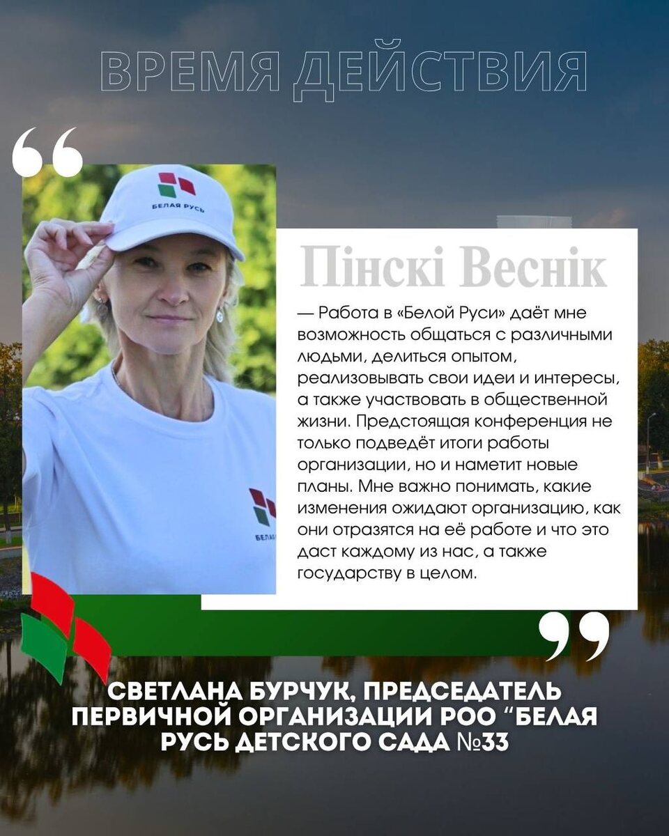 #Время_действия 📌Светлана Бурчук, председатель первичной организации 🇧🇾РОО «Белая Русь» детского сада №33 - Работа в «Белой Руси» даёт мне возможность общаться с различными людьми, делиться опытом, реализовывать свои идеи и интересы, а также участвовать в общественной жизни. Предстоящая конференция не только подведёт итоги работы организации, но и наметит новые планы. Мне важно понимать, какие изменения ожидают организацию, как они отразятся на её работе и что это даст каждому из нас, а также государству в целом. #БелаяРусь #Съезд #Мнения 📍📍@Пинский Вестник ЮТУБ | САЙТ| ИНСТ | ВК | ОК | ФЕ | Прислать новость