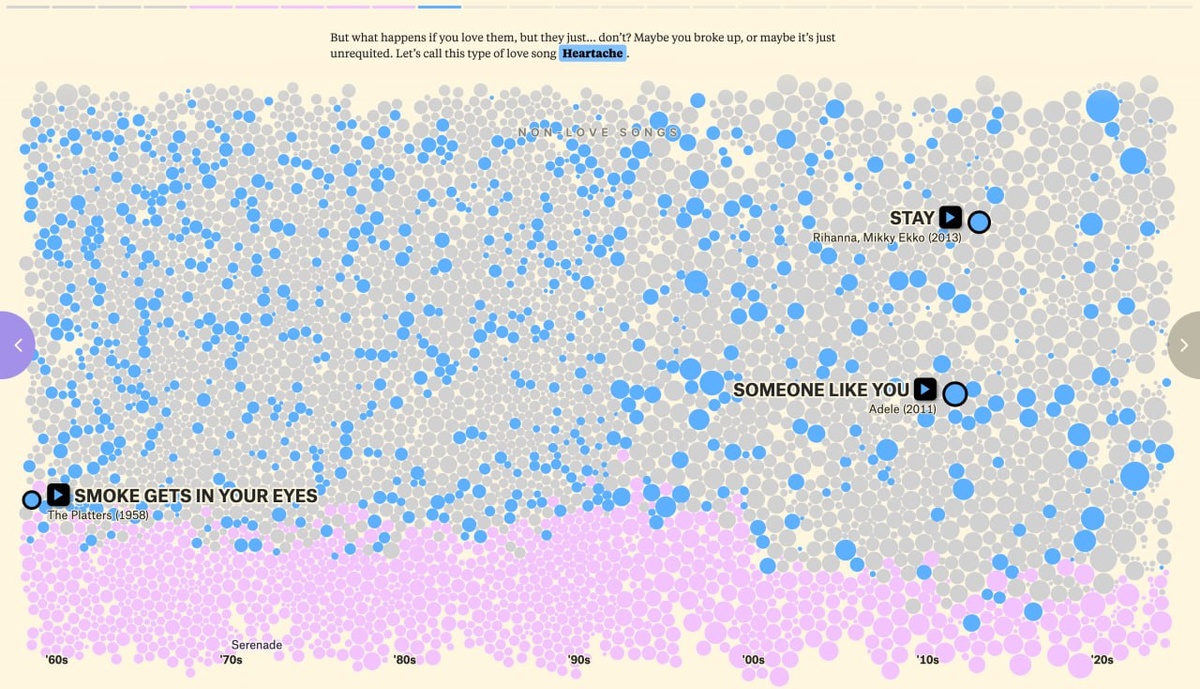 Представляем вам новые впечатляющие проекты, появившиеся в рамках программы Information is Beautiful Awards 2024, посвященной визуализации данных. Среди наиболее ярких работ: – «Умирает ли любовная песня?» – исследование изменения темы любви в музыке за последние семь десятилетий. – «Зоонозный веб» – инфографика о том, как люди могут подхватывать болезни от домашних животных. – «Мир в осязаемых фрагментах» – российский дизайнер создала уникальный скетчбук с «живыми» визуализациями, используя бисер, вырезки, иголки и нитки. – «Я хочу лучшую катастрофу» – блок-схема, которая отвечает на вопросы о глобальном потеплении через интерактивный диалог. Все остальные проекты доступны для ознакомления. Наш уютный канальчик 🤖 Анимация | СhatGPT-4 | Помощь с резюме