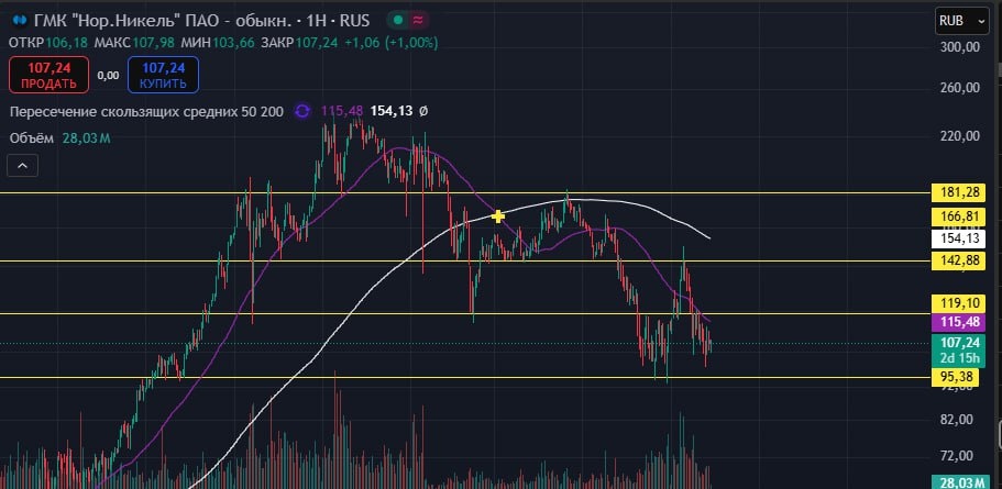 $GMKN 📉Краткосрочный тренд нисходящий. 🕯Сильный уровень поддержки 98, от него уже два раза оттолкнулся. 🔼В данный момент пытается дойти до 119,1. Если это сопротивление будет пробито, то скорее всего, увидим движение до 142 руб. 🔽Если всё-таки пробьет поддержку, то падение продолжится и цена упадёт до 80 руб. Фигуры пока никакой не построено и не подтверждено, поэтому заходить в актив опасно. НЕ ИИР #теханализ #трейдер #инвестиции #норникель