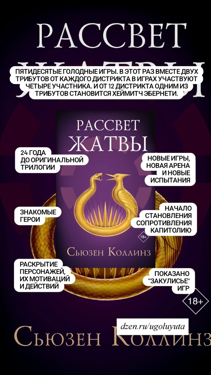 Прочитала "Рассвет жатвы" - новая книга из вселенной про Голодные игры. Хеймитч - тот самый наставник Китнисс из трилогии, и это его история. Мы заранее знаем чем всё закончится и кто будет победителем, но здесь главное не цель, а путь - как герой к этому пришёл и какие с ним произошли метаморфозы. Здесь много уже знакомых героев, они получают свои истории. Единственный минус - в некоторых моментах Хеймитча как будто специально "вели" и "продвигали". Очень понравилась концовка - с намёком на будущее.