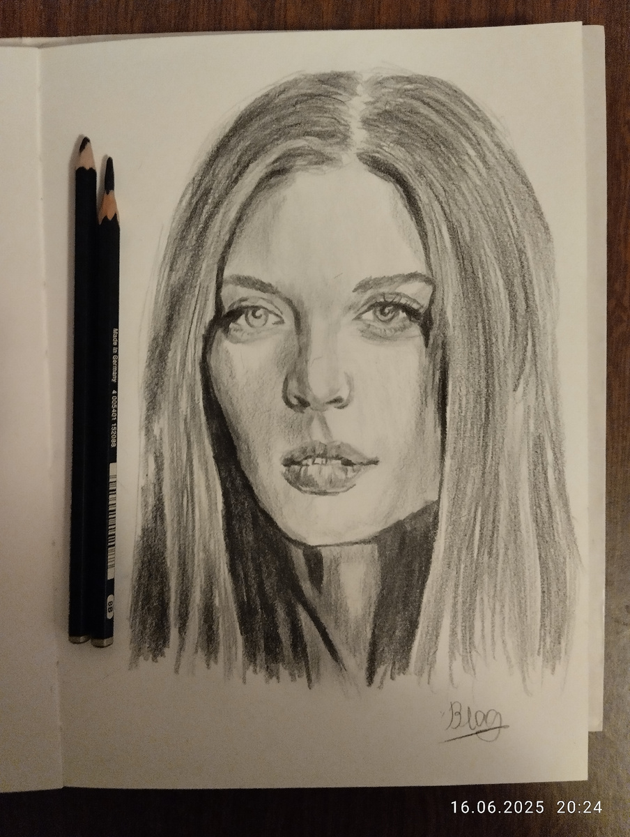 Этот портрет я так же рисовал матовыми карандашами Faber Castle. В последнее время с рисованием портретов у меня возникают небольшие трудности. Этот не стал исключением. Сделав набросок я как обычно приступил к прорисовке лица. Сразу же возникли проблемы с прорисовкой носа, пришлось несколько раз его исправлять. В целом передать сходство получилось плохо, девушка на рисунке выглядит старше. Но и такая работа тоже опыт. Благодарю за внимание.
