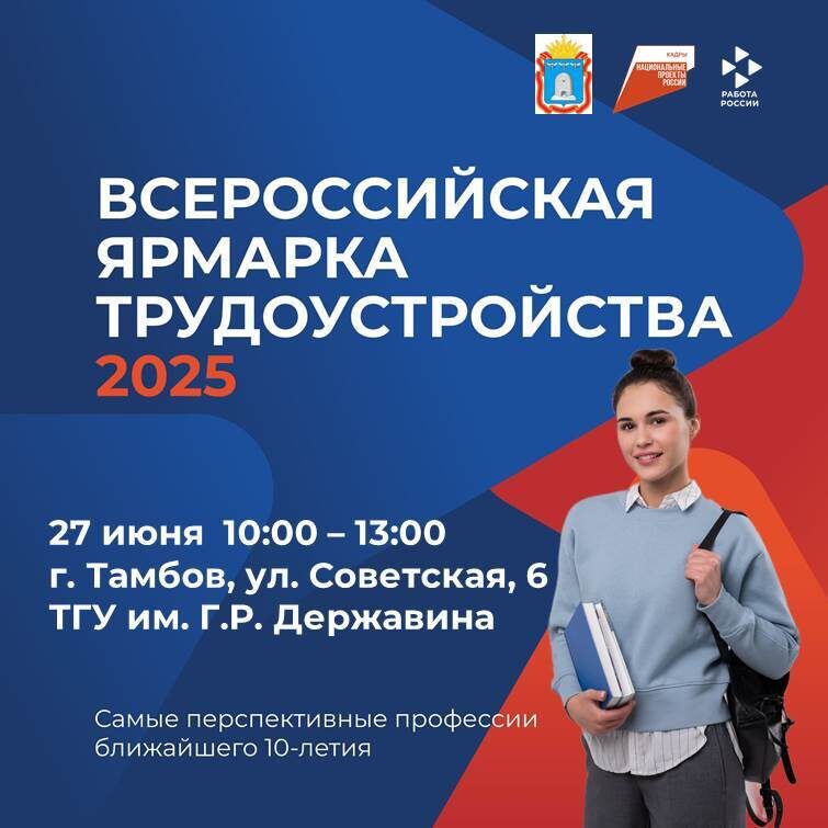 27 июня в Тамбовской области состоится федеральный этап Всероссийской ярмарки трудоустройства «Работа России. Время возможностей». В Тамбове ярмарка пройдет в ТГУ им. Г.Р. Державина (улица Советская, 6) с 10 до 13 часов. Современные пространства, еще больше активностей, еще больше возможностей для вашей карьеры! На мероприятии вы сможете: 🔹пройти собеседования у работодателей и найти работу своей мечты; 🔹узнать о карьерных возможностях и имеющихся социальных программах; 🔹посетить профориентационные тренинги, анкетирование, экспресс-диагностику; 🔹поучаствовать в командообразующих играх и мини-сессиях, квизах; 🔹побывать на Фестивале профессий и его активностях. Будущее за теми, кто действует сейчас!