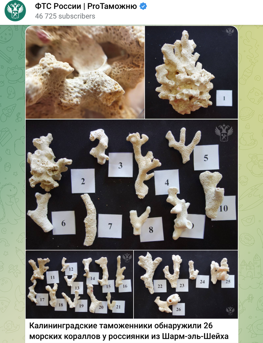 Федеральная таможенная служба 18 июня сообщила о том, что калининградские таможенники обнаружили и изъяли 26 морских кораллов у россиянки, прилетевшей из Шарм-эль-Шейха, возбудив в отношении нее два дела об административном правонарушении. И это не единичный случай, такие новости появляются в прессе регулярно.