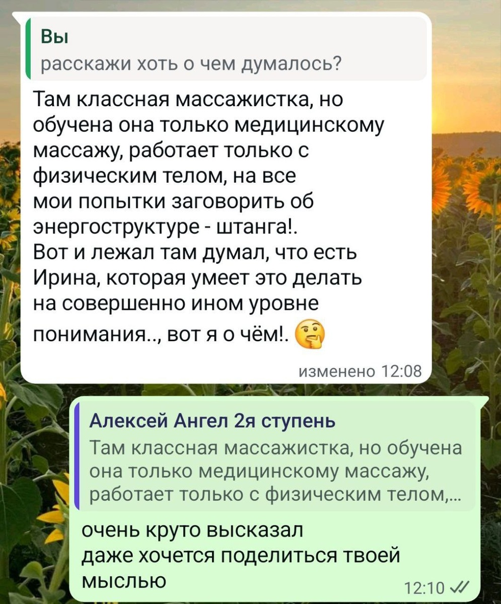 ✨ Массаж, который возвращает тебя к себе ✨ Сегодня я лежал на сеансе медицинского массажа. Массажистка была хорошая, профессиональная, но всё время оказывалось не тем… Она знает анатомию, четко выполняет движения, воздействует на мышцы – всё отлично. Но она не видит самое главное – энергоструктуру. Вот такое сообщение 👆мне пришло на днях. Теперь давайте подробнее разберем это. Каждое тело – это не просто физическая оболочка. Это дом для нашего духа, для задач, с которыми мы пришли в это воплощение. Каждое тело уникально, оно имеет свою собственную структуру, предназначенную для выполнения задач здесь, на Земле. В момент рождения мы выбираем его. Полное, эталонное тело, которое полностью соответствует нашей миссии. Но ведь как часто жизненные сложности, страхи и блоки превращают потоки энергии в хаос. Они начинают сбиваться с пути, и тело меняется, теряя гармонию и силу. Боли, усталость, опухоли – это не просто физические последствия, но отражения внутри. Именно поэтому люди прихо