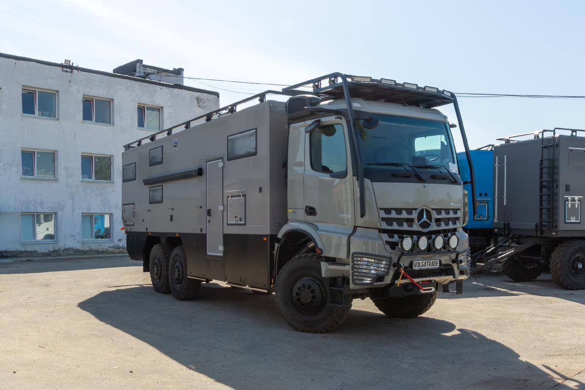 Внедорожный автодом на базе Mercedes-Benz Arocs 6х6 – масштабный проект ВолгаТрейд с яркой брутальной внешностью! Фургон длиной 8,2 м позволил разместить на борту всё необходимое для комфортного отдыха: 6 спальных мест, просторную гостиную зону, функциональную кухню, санузел и душевую. Мощное шасси обеспечивает отличную проходимость и уверенность на дороге, позволяя покорять любые маршруты, а уютный интерьер создаёт домашнюю атмосферу, где вы сможете расслабиться и насладиться путешествием. Идеальное сочетание внедорожных возможностей и высокого уровня комфорта! ⚠️ Коротко о проекте: • Шасси Mercedes-Benz Arocs • Фургон из сэндвич-панелей 8200мм х 2400мм х 2000мм. Утепление стен 60мм, пола – 120мм • Балкон-терраса, маркиза-тенты и летняя кухня • Механизм подъема для запасного колеса на задней панели фургона • Багажные ящики и отсеки для хранения по периметру • Окна и люки с москитными сетками и шторками • Вся мебель из влагостойкой фанеры • Шкафы для одежды и вещей • Спальный