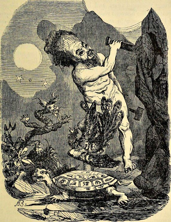 Как и все древнейшие цивилизации, Китай имеет свою сложную мифологическую систему, которая начинается с традиционной для все культур легенды о сотворении мира и появлении в нем человека. Когда привычного нам мира не существовала, во вселенной царил хаос, похожий на гигантское яйцо. Внутри него царила тьма, смешанная с первозданной энергией Ци. Проходили тысячелетия, пока в этом яйце не зародился первый живой дух – Пангу. Забвение великого первопредка в пустой и холодной вселенной продолжалось 18 000 лет, пока однажды Пангу не открыл глаза. Пробудившись, он почувствовал тесноту и решил освободиться. Дух рогами и зубами расколол скорлупу и тем самым создал привычный нам мир. Верхняя часть яйца поднялась и стала небом (Ян – светлое, лёгкое начало), а нижняя опустилась, превратившись в землю (Инь – тёмное, тяжёлое начало).