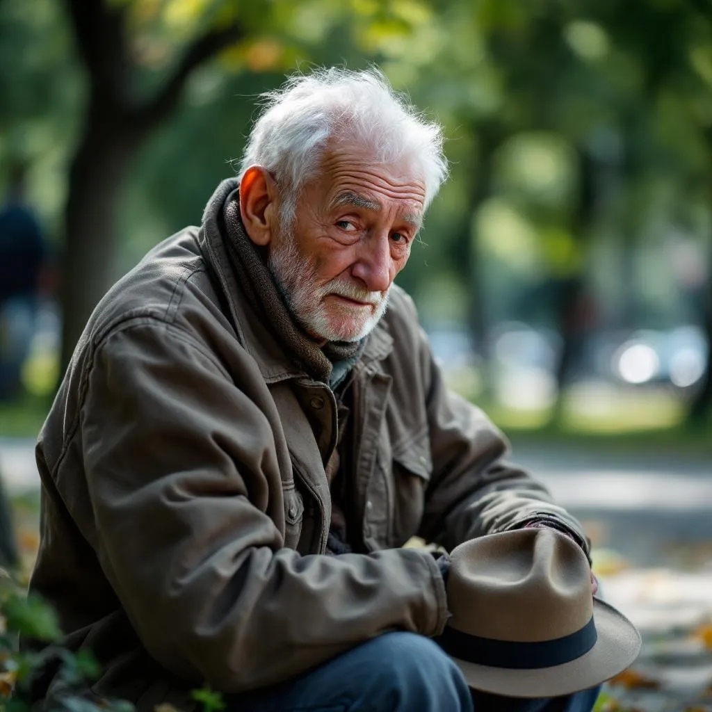 Неподалёку от подземного перехода их взгляд привлёк пожилой мужчина. Он стоял, опираясь на палку, у ног — старая фетровая шляпа с мелочью. Одет он был в поношенный плащ и потрёпанные ботинки. Лицо было обветренное, но спокойное, с глазами, в которых жила усталость и мудрость.