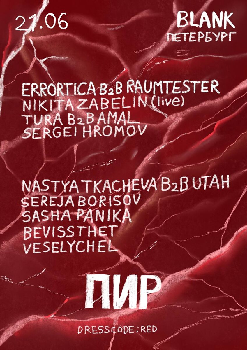 Вечеринка ПИР в Бланке СПб 21 июня Пир в Петербурге обещает стать по-настоящему незабываемым событием. Впервые на одной сцене встретятся мама Света — истинная королева танцпола Errortica с ее по-настоящему беспощадными раздачами, и папа ПИРа, харизматичный Raumtester. Этот б2б-сет, несомненно, будет полон сюрпризов и, конечно же, жара. Им составит компанию отец Resonance и один из ведущих визионеров российской электронной сцены — Nikita Zabelin, который в первый раз представит свой техно-лайв в Петербурге. Также в программе — уникальный б2б, который последний раз звучал на приквеле ПИРа — Tura и Amal. Максимальное погружение в атмосферу обеспечит резидент Катэраг, Sergei Hromov, который всегда тонко чувствует настроение танцпола. Настроением веранды займутся резиденты Blank и их близкие по духу друзья. Главный хайлайт вечера — потрясающий b2b-дуэт двух близких подруг и фанаток винилового звучания — Nastya Tkacheva и Utah, которые были полюблены слушателями за свои изысканные сеты. К