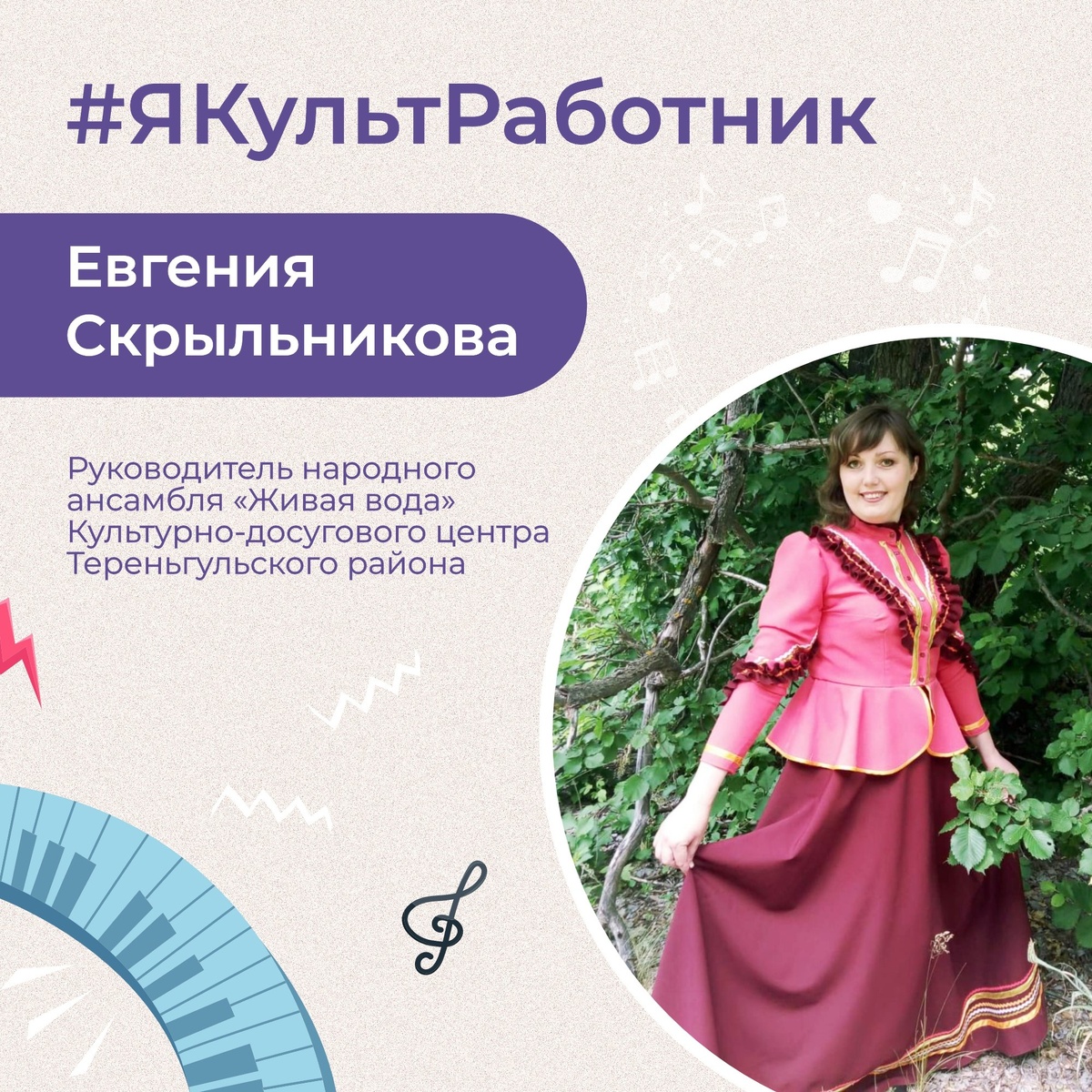 Евгения Скрыльникова — руководитель народного ансамбля «Живая вода» из Тереньгульского района Музыка играет большую роль в её жизни. Она помогла Евгении определиться с профессией, научила не сдаваться в трудные моменты и до сих пор вдохновляет двигаться вперёд. Своё дело Евгения любит всей душой и старается делать всё, чтобы народное творчество развивалось. Подробнее — в карточках