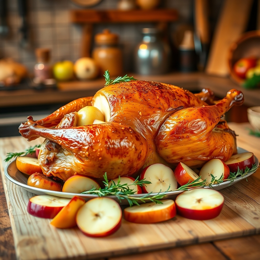 Ингредиенты: Утка — 1,5–2 кг Яблоки — 3–4 шт. (лучше кислых или сладко-кислых, например, сорта Антоновка или Гренни Смит) Соль — по вкусу Черный перец — по вкусу Травы (розмарин, тимьян, лавровый лист) — по желанию Чеснок — 3–4 зубчика Мед или сироп — 1-2 ст. л. (по желанию, для карамелизации) Масло (растительное или сливочное) — для смазывания Для маринада (по желанию): Апельсиновый сок или вино — для маринования Инструкция: Подготовка утки: Тщательно промойте утку, обсушите бумажными полотенцами. Обрежьте лишний жир и кожу, если нужно. Натерите утку солью, перцем и любимыми травами внутри и снаружи. Можно оставить утку мариноваться в холодильнике на 1-2 часа или на ночь для большей мягкости. Подготовка яблок: Яблоки вымойте, удалите сердцевину и нарежьте крупными кусками или дольками. Можно немного сбрызнуть яблоки лимонным соком, чтобы они не потемнели. Начинка и запекание: Внутрь утки положите часть яблок и чеснока. Можно добавить веточки розмарина или тимьян