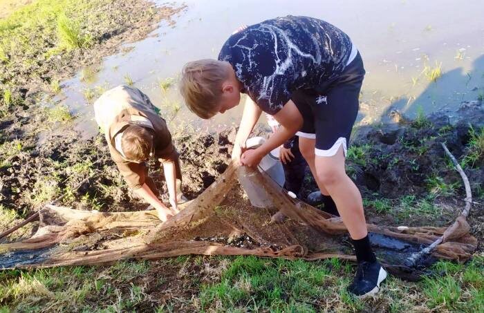 Работы развернулись в Камызякском районе. Первые школьные экологические отряды региона уже приступили к работе на отшнурованных водоемах, откуда не может выйти рыбная молодь, оказавшаяся в ловушке из-за стремительного ухода воды. Одними из первых вышли патрули Камызякского раойна, которым предстоит обработать порядка 50 участков общей площадью в 764 га. По информации тг-канала районной администрации, на спасение рыбной молоди выйдут 9 отрядов в составе более 60 учащихся из Раздорской, Самосдельской, Травинской, Чаганской, Каралатской, Полдневской, Жан-Аульской, Караулинской и Иванчугской школ. На своих участках уже работают школьники Самосдельской СОШ имени В.А.Шитова. За два дня им удалось обработать 800 кв. метров водоемов и спасти 1350 штук мальков. Основные работы пока ведутся на ерике Караколь. «Мы уверены, что наша работа принесет большую пользу природе родного края. На спасение рыбной молоди выходим ежедневно, попутно исследуем видовой состав рыбы, а еще очищаем от мусора прибре
