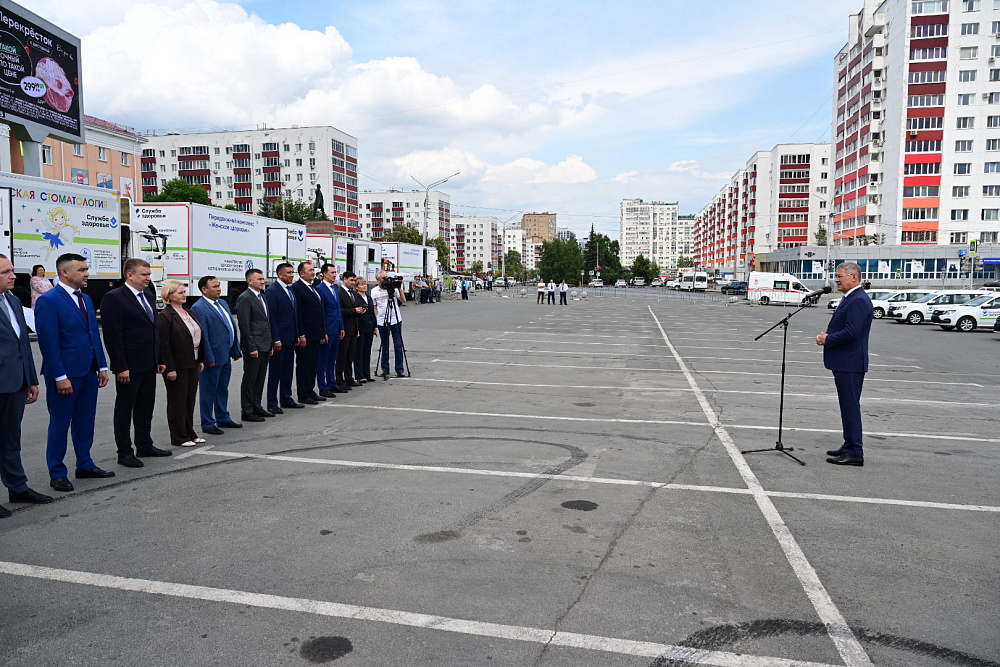 В Уфе, 18 июня, на территории перед Конгресс-холлом «Торатау» состоялась торжественная передача 31 нового автомобиля руководителям медицинских организаций Башкортостана. Ключи от машин вручил лично Глава республики, Радий Хабиров, приурочив это событие к профессиональному празднику – Дню медицинского работника. Приобретение автотранспорта стало возможным благодаря реализации программы модернизации первичной медицинской помощи, финансируемой, в том числе, из федерального бюджета в рамках национального проекта «Продолжительная и активная жизнь». Радий Хабиров выразил признательность работникам здравоохранения за их преданность делу и отметил необходимость постоянного улучшения материальной базы отрасли. «Поздравляю с Днем медицинского работника! Желаю вам успехов, благополучия и крепкого здоровья, – сказал Радий Хабиров. – Мы продолжаем обновление автопарка медицинских учреждений, что значительно облегчает работу первичного звена». После церемонии Глава Башкортостана осмотрел новые автом