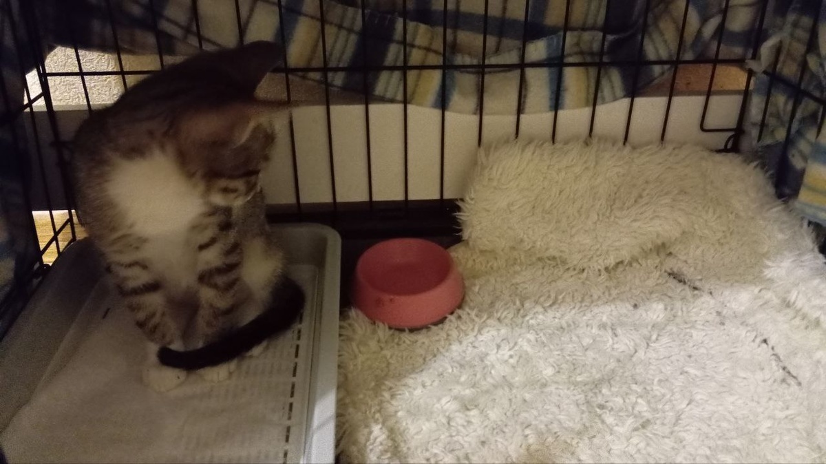 Вчера Лена Неврова привезла ему клетку побольше — и это уже не клетка, а целый котодом на одного хозяина! Внутри у него теперь уютное спальное место, миски, лоточек и даже немного свободного пространства для кошачьих «размышлений о жизни».