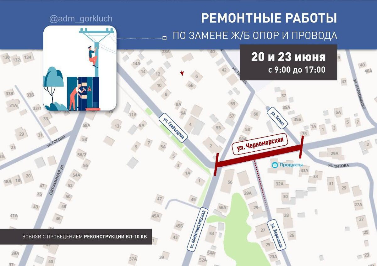 20 и 23 июня с 9:00 до 17:00 в связи с реконструкцией воздушной линии 10 кВ и проведением ремонтных работ по замене железобетонных опор и провода будет полностью ограничено движение на участке автодороги по ул. Черноморская – от пересечения с ул. Титова до пересечения с ул. Грибоедова.