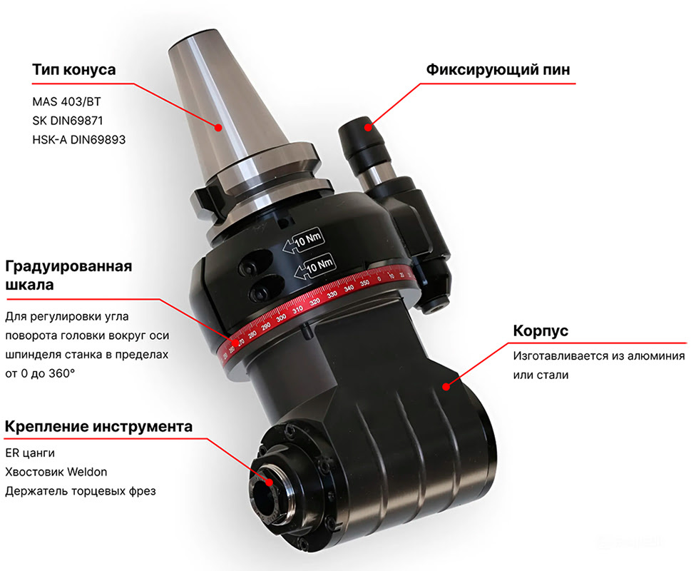 Угловые головки с регулируемым углом - позволяют изменять угол наклона инструмента (обычно в пределах ±90°) под конкретную операцию. Их основное преимущество перед фиксированными моделями – гибкость: оператор может настроить нужный угол для конкретной операции, что критично для фрезерования или сверления под произвольными углами. Ключевая ценность заключается в значительном сокращении необходимости переустановки самой заготовки. Это особенно эффективно при обработке сложных деталей с труднодоступными зонами и точной обработке локальных участков на крупных заготовках, обеспечивая доступ инструмента без перемещения детали. Благодаря этой адаптивности регулируемые угловые головки незаменимы для сложных операций, расширяя функциональность фрезерных станков с ЧПУ.