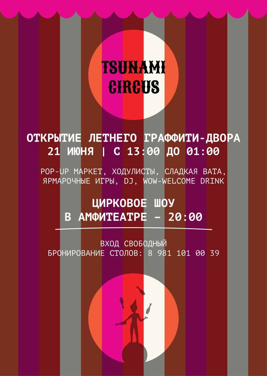 Цирковое шоу и открытие летнего граффити-двора 🎪 21 июня с 13:00 TSUNAMI шумно открывает самый яркий двор и летнюю террасу! В программе дня: pop-up маркет, ходулист, скетч-художница, станция с сахарной ватой, ярмарочные игры, где можно выиграть подарки, wow-welcome drink ✨ А в 20:00 собираемся в амфитеатре, где пройдет самое настоящее цирковое шоу — приготовьтесь удивляться. Для всех желающих встретить это лето ярко и весело! 📞 Забронировать стол в ресторане и на граффити-террасе можно по телефону 8 981 101 00 39 💵 Вход свободный 🗓 21 июня с 13:00 📍 Лиговский, 37 Подписывайся на Пойдем выпьем