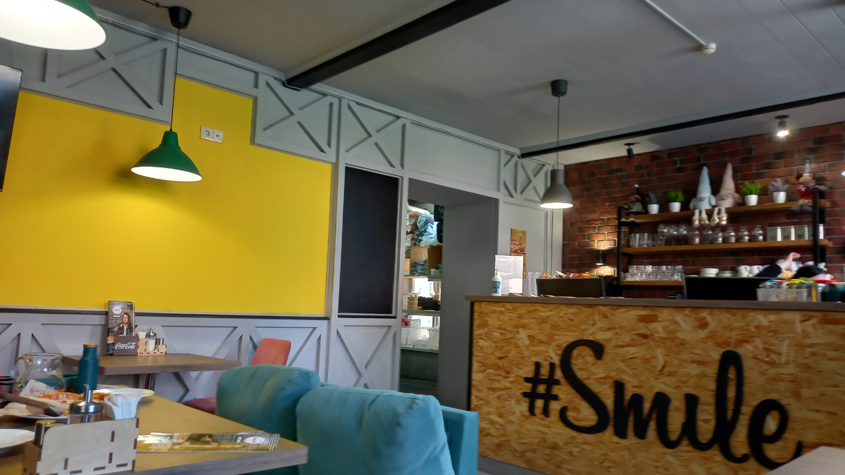 Маленькое кафе на несколько столиков с дешевыми, но удобными стульями и диванами. В целом дизайна не очень много, обработанные стены, барная стойка и окраска. Ибо упор сделан на доставку, буду оценивать это как хаб для доставщиков и редких гостей зала. Миленько и достаточно, вопросов нет.