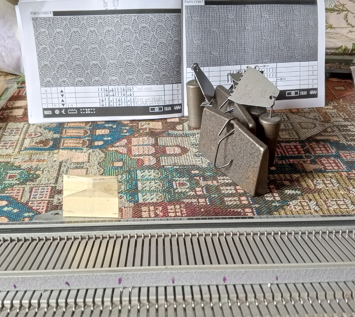 Согласно карте, каждая пятая игла выведена из работы. Работаем на одной фонтуре, используем нить 1 цвета и выдвижную гребёнку 1:5. Выдвинули из оставшихся игл 1 через пять. Вот так: Рычаги от себя. Провязываем 5 рядов. Образовали 5 накидов на выдвинутых иглах. Рычаги двинули на себя. Провязали 1 ряд. Все иглы в работе. Третий ордер: выдвигаем в ПНП по две крайние иглы от неработающих игл. Провязываем 5 рядов. Образовались 5 накидов длиной в три иглы! (бОльшой накид!) Рычаги на себя, провязываем один ряд. Все повторяем. С четвертым узором мне очень долго пришлось договариваться... С игл накиды слетали и боковые грузы постоянно нужно перевешивать. 🤦.