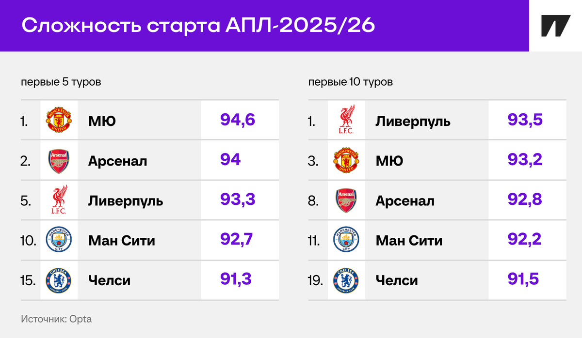 Самый сложный старт сезона по версии аналитической компании Opta – у «МЮ» с «Арсеналом» (в первых пяти турах) и у «Ливерпуля» (в первых 10).
